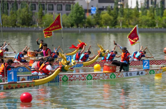 当日,2025年西藏自治区端午节牛皮船(龙舟)赛在拉萨滨河公园水域举行。来自全国各地的160名选手组成的10支龙舟队伍和20支牛皮船队伍同在高原竞渡,吸引众多观众到场观看。