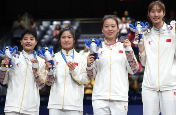 7月20日,中国队球员王小青、刘贝、张涛和高梓悦(从左至右)在颁奖仪式上。新华社记者 张晨 摄