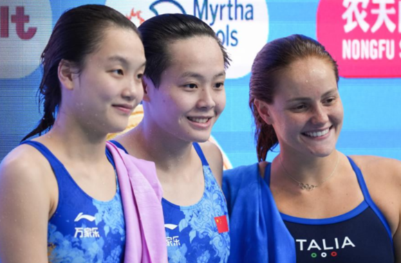 当日,在新加坡举行的2025年世界游泳锦标赛跳水女子3米板决赛中,中国选手陈艺文、陈佳包揽冠亚军。