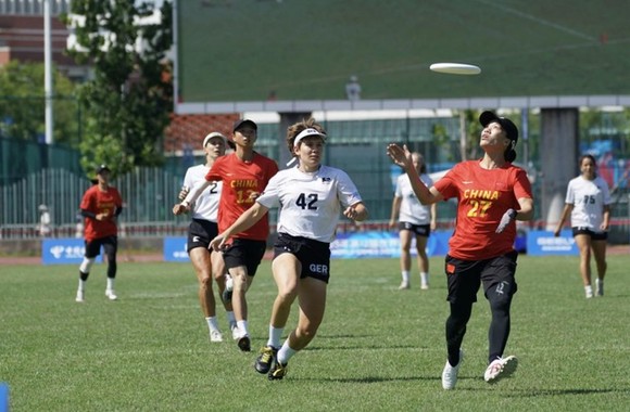 8月12日,世运会团队飞盘项目在成都体育学院三岔湖校区田径场迎来首个比赛日。中国飞盘队首场对阵德国队,攻防转换、协同合作,十分精彩。