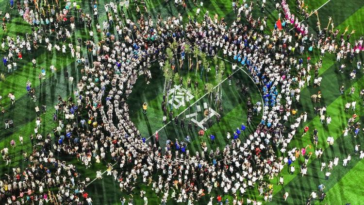 8月23日,人们在贵州“村超”球场跳苗族芦笙舞(无人机照片)。新华社记者 杨文斌 摄