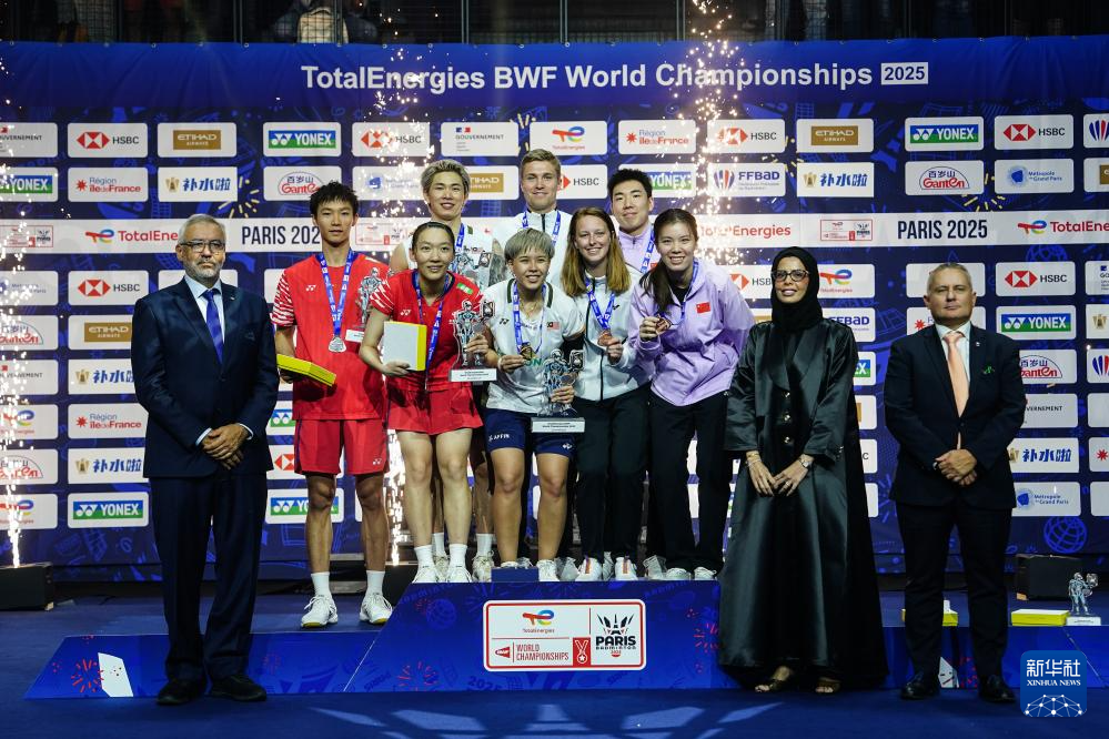 8月31日,冠军马来西亚组合陈堂杰(左四)/杜颐沩(中下)、亚军中国组合蒋振邦(左二)/魏雅欣(左三)和季军中国组合郭新娃(右四)/陈芳卉(右三)及法国组合吉凯尔(中上)/德尔吕(右五)在颁奖仪式上合影。