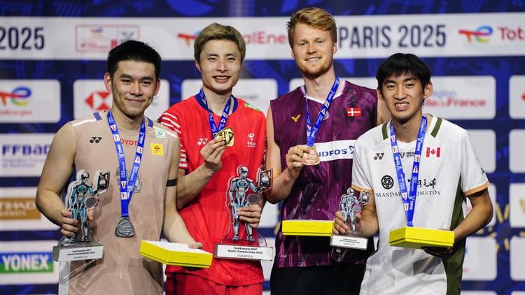 8月31日,冠军中国选手石宇奇(左二)、亚军泰国选手昆拉武特(左一)和季军丹麦选手安东森(右二)、加拿大选手赖浩俊在2025年世界羽毛球锦标赛男单颁奖仪式上。新华社记者彭子洋 摄