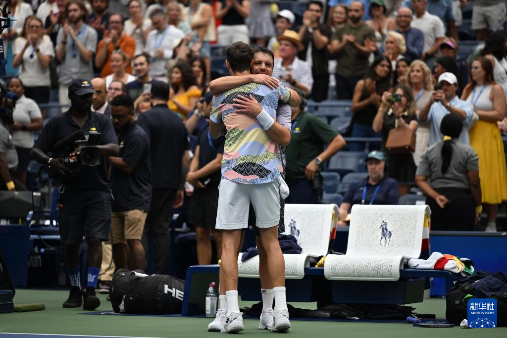 9月6日,格拉诺列尔斯(右前)/塞瓦略斯(左前)和索尔兹伯里(右后)/斯库普斯基在比赛后拥抱致意。
