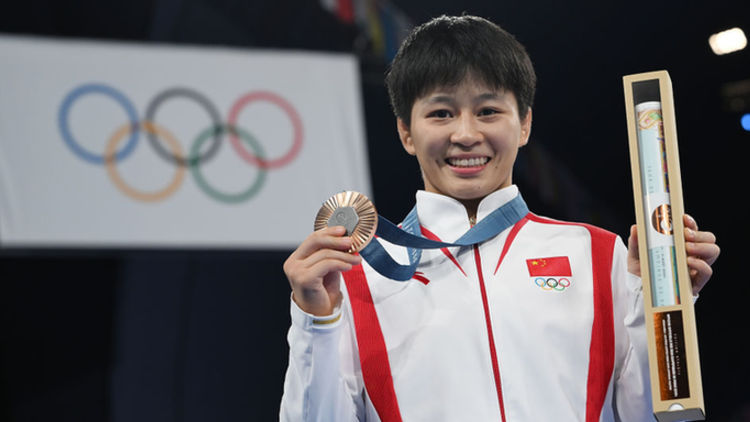 2024年8月9日,巴黎奥运会摔跤女子自由式57公斤级季军洪可新在颁奖仪式上。新华社记者 武巍 摄