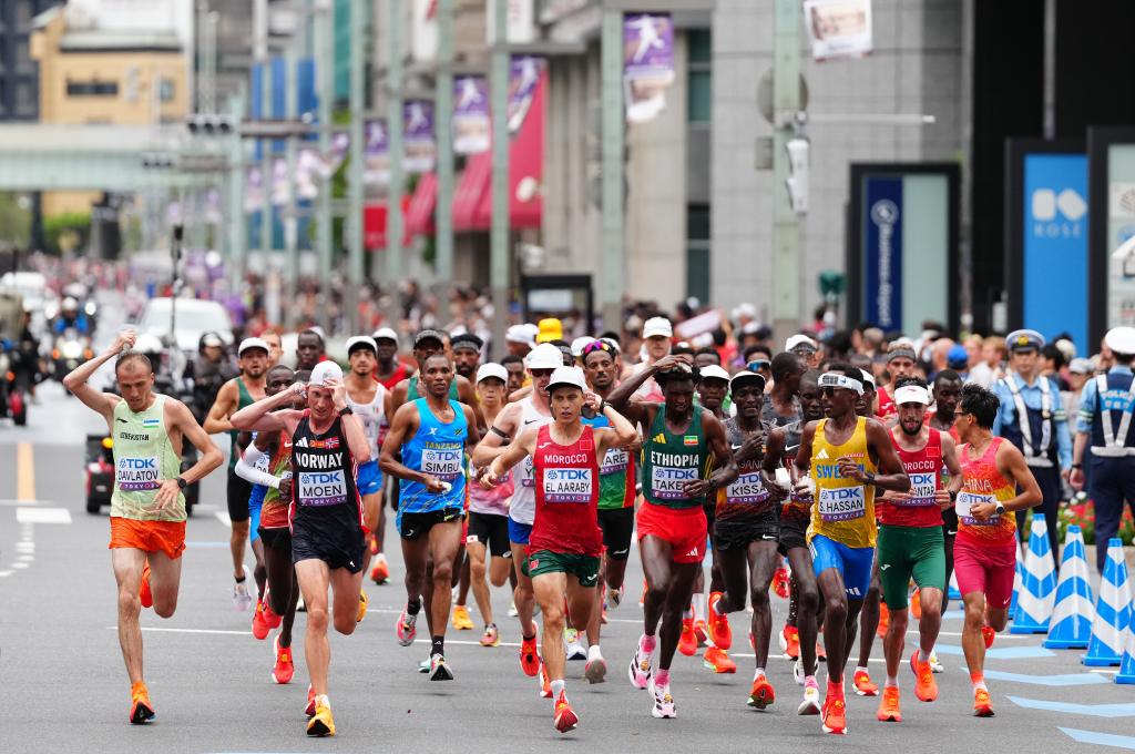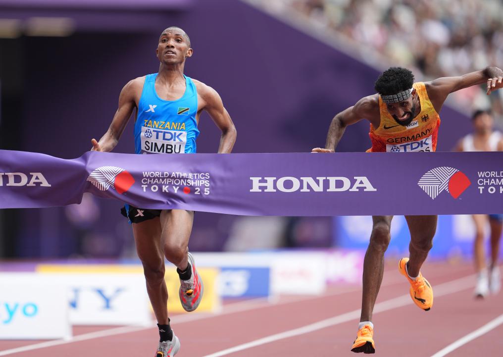 由于湿度较高给比赛带来不小的困难,参赛选手大多选择较为保守的战术。比赛进行到35公里处时,领先集团还有十多名运动员。进入终点线所在的东京国立竞技场时,领先集团已经缩减到三人,彼得罗斯处于领跑位置,辛布和意大利的奥瓦尼紧随其后。最后200米处,彼得罗斯加速冲刺,但是进入最后的直道后,辛布的冲刺能力和体力更胜一筹,他逐渐追上并在终点线前力压对手,以0.03秒的优势夺冠。这是世锦赛历史上坦桑尼亚选手获得的首枚金牌。