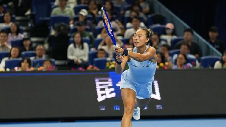 9月29日,郑钦文在比赛中回球。新华社记者 那宇奇 摄