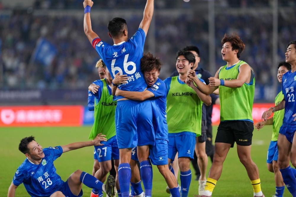 10月4日,南京队球员赛后拥抱庆祝胜利。当日,在江苏南京举行的2025江苏省城市足球联赛(“苏超”)四分之一决赛中,南京队主场与连云港队在常规时间1:1战平,通过点球大战,南京队以5:3的总比分战胜连云港队,晋级半决赛。新华社记者李博 摄