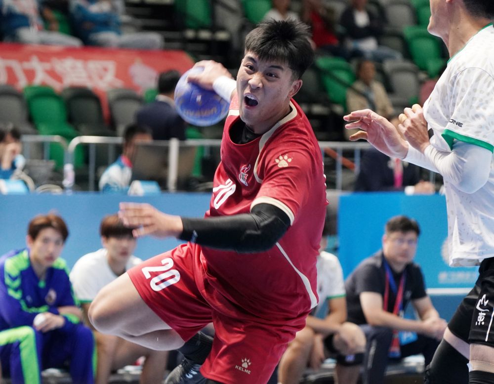 11月3日,山西队球员刘文东(左)在比赛中进攻。当日,在香港启德体艺馆举行的第十五届全国运动会男子手球预赛B组比赛中,山西队33比32战胜山东队。新华社发(王申摄)