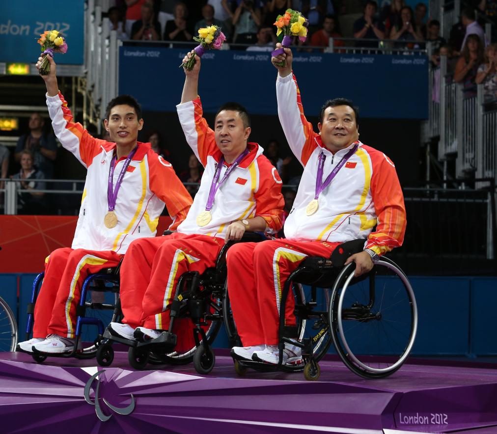 2012年9月7日,在伦敦残奥会乒乓球男子团体3级决赛中,中国队以3:2战胜德国队,获得冠军。图为中国选手冯攀峰、高延明和赵平(从左至右)在颁奖仪式上。新华社记者白雪飞 摄