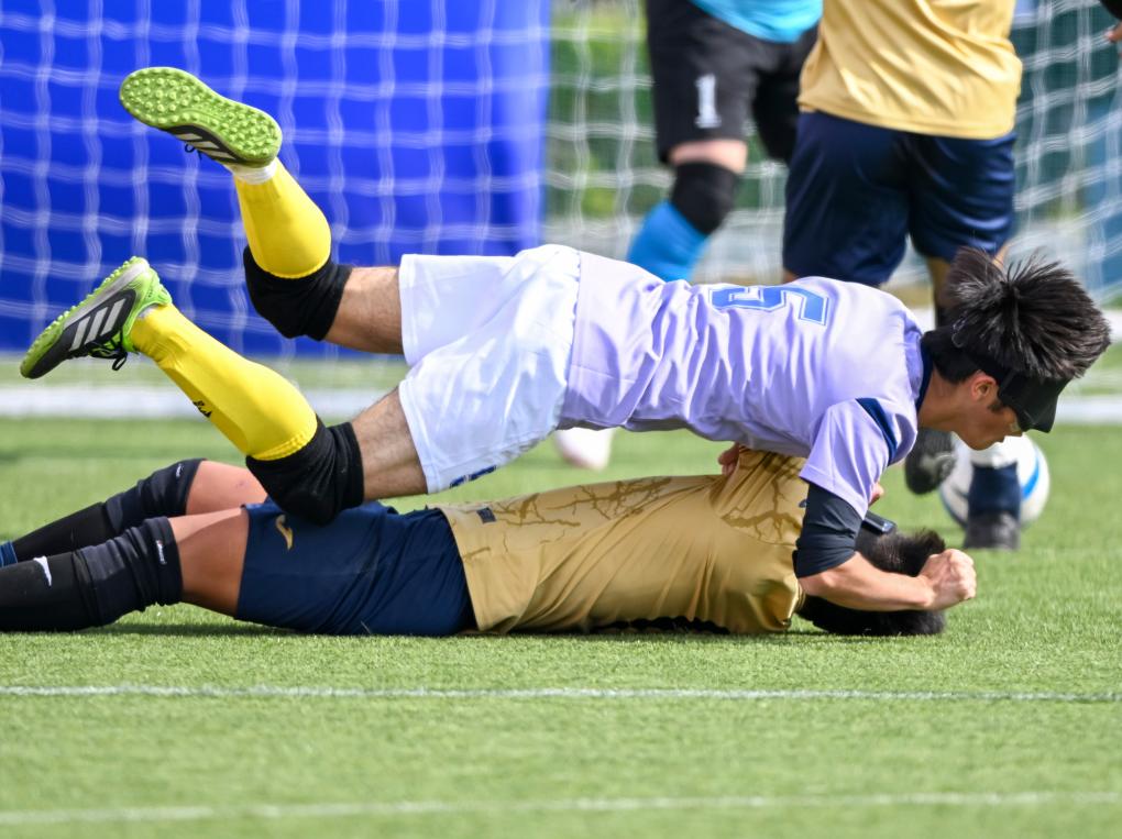 12月14日,在广州举行的全国第十二届残疾人运动会暨第九届特殊奥林匹克运动会盲人足球项目男子组小组赛中,天津队1:0战胜广东二团队。图为天津队球员范海林(上)与广东二团队球员林显晴在拼抢时摔倒。新华社记者陈浩明 摄
