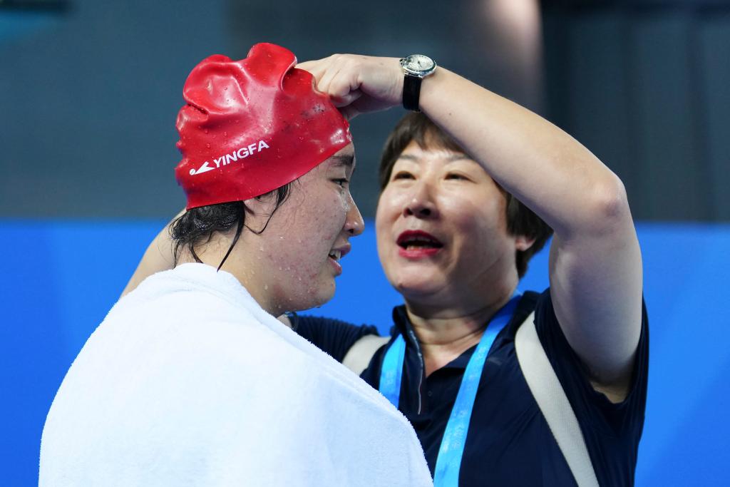 12月13日,教练在女子16-21岁组200米自由泳决赛第3组比赛结束后帮助云南队选手马晨曦(左)摘泳帽。她获得该组别季军。新华社记者齐芷玥 摄