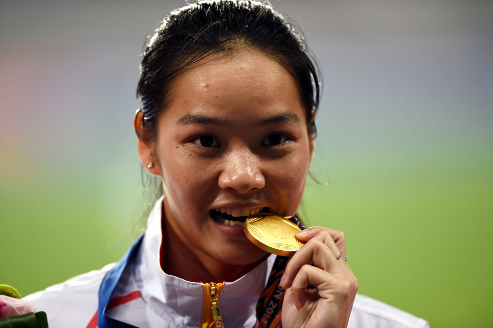 2014年9月28日,韦永丽在仁川亚运会田径项目女子100米决赛颁奖仪式上。新华社记者 蔺以光 摄