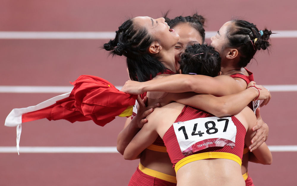 2021年8月6日,中国女子接力队在比赛后拥抱庆祝。新华社记者李钢 摄