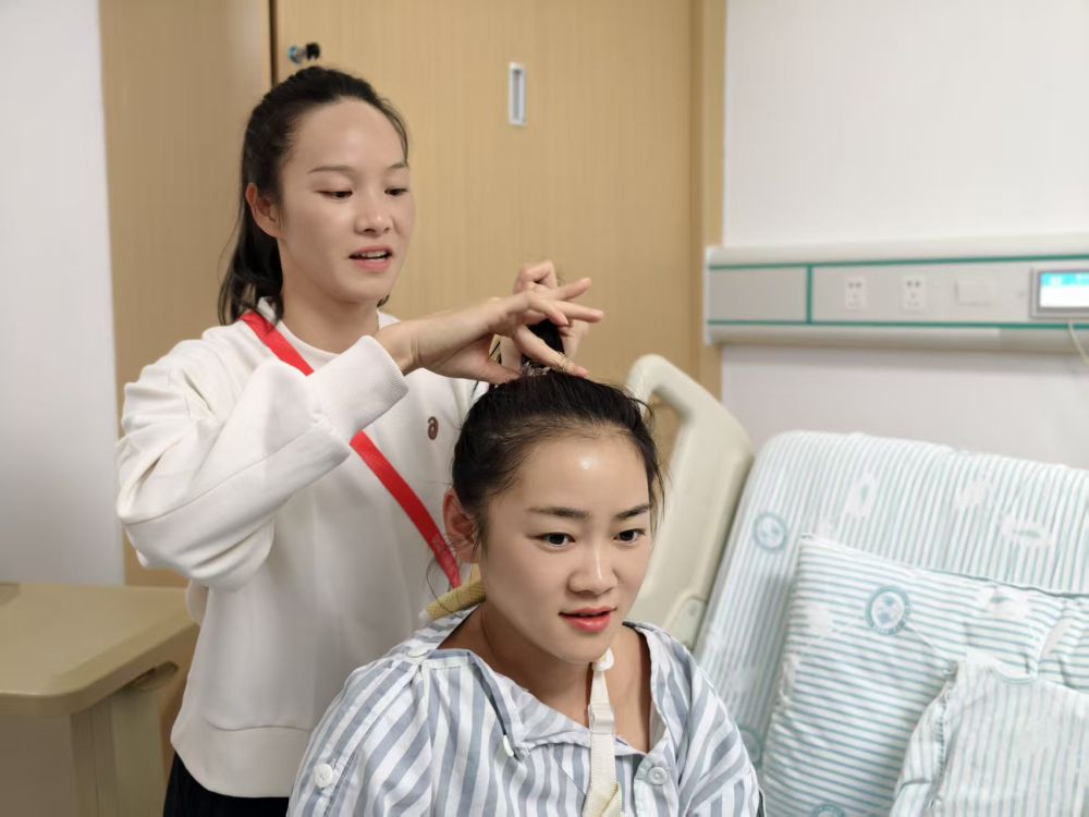 韦永丽在医院为梁小静扎头发。田兵 摄