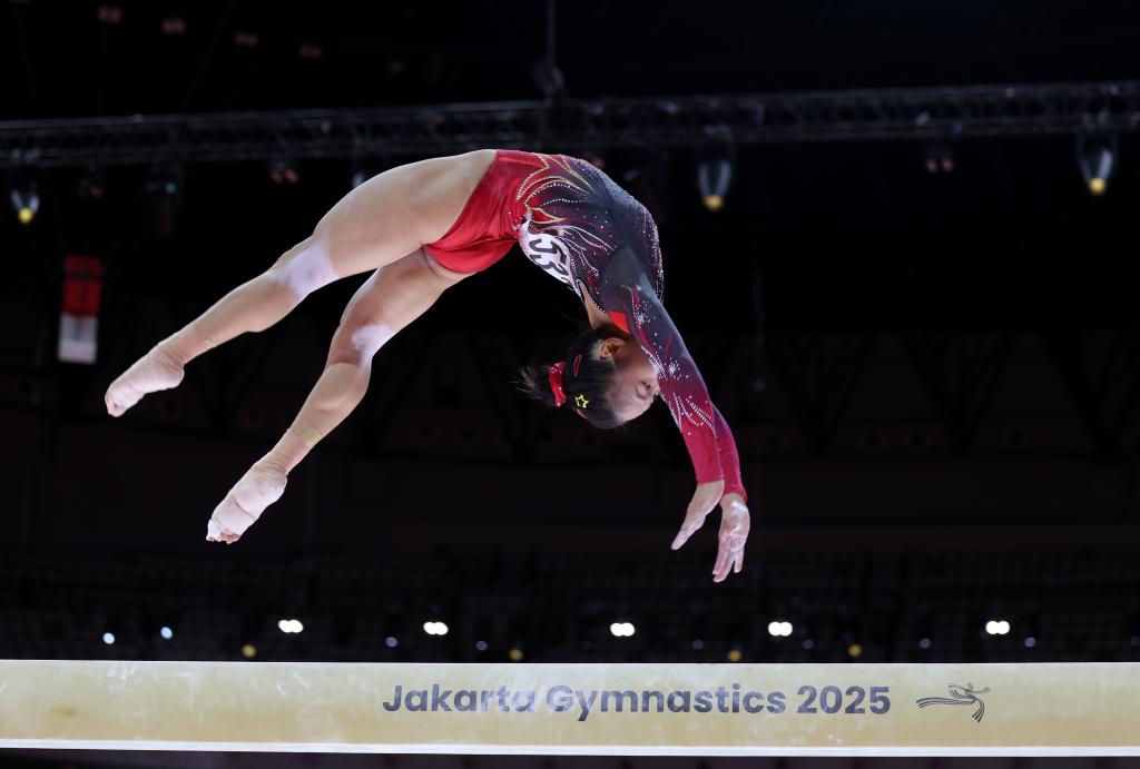 10月25日,中国选手张清颖在2025年国际体操联合会(FIG)竞技体操世锦赛女子平衡木决赛中夺得冠军。新华社记者 白雪飞摄