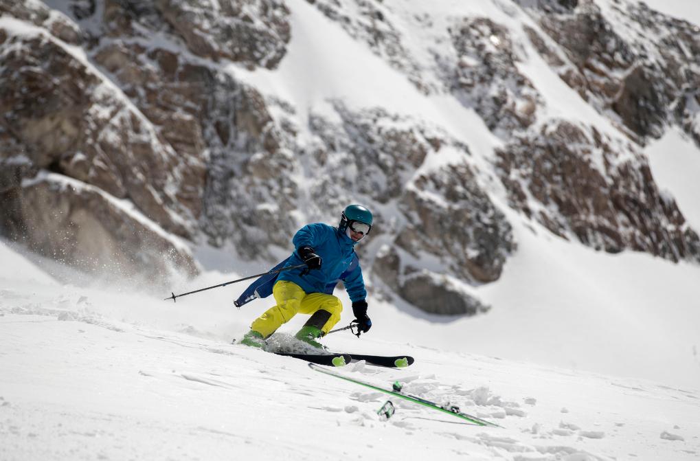 2017年5月15日,参加2017青海岗什卡国际滑雪登山挑战赛的选手从雪坡上滑下。新华社记者 费茂华 摄