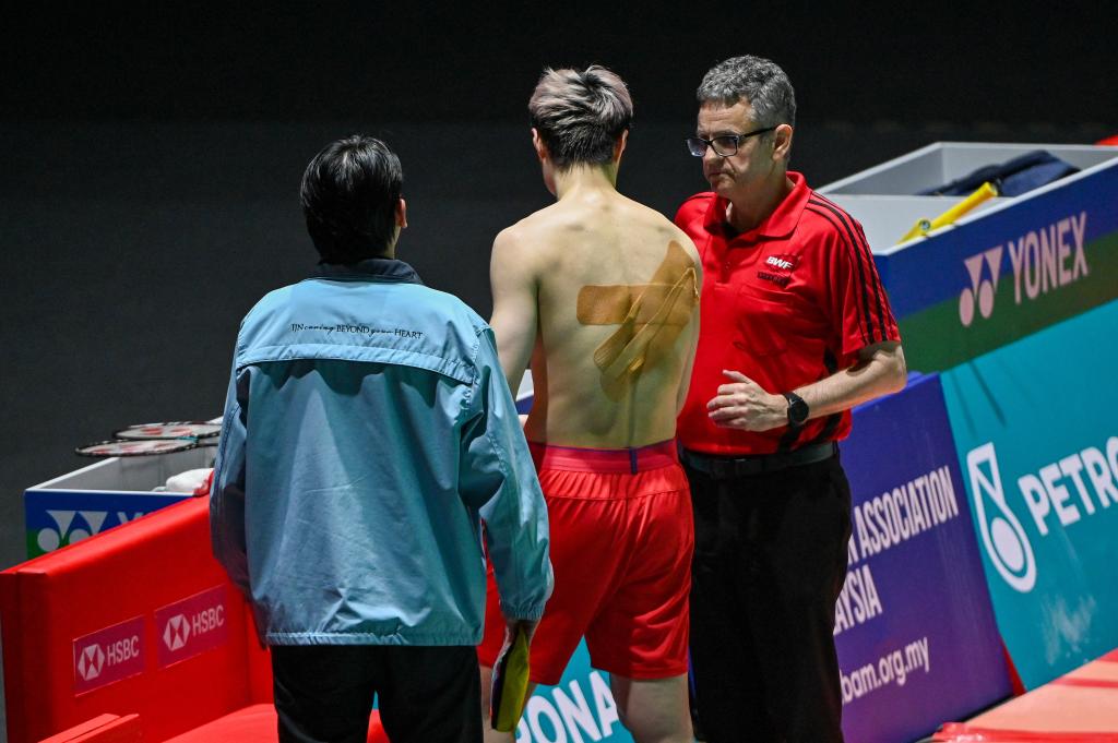 ↑1月11日,中国选手石宇奇(中)在男单决赛中因伤退赛