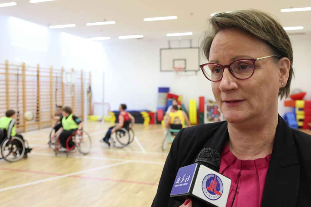 1月13日,匈牙利残奥委会秘书长乌尔·奥妮塔在参观匈牙利康复治疗机构和残疾儿童体育中心时接受新华社记者采访。新华社发(弗尔季·奥蒂洛摄)