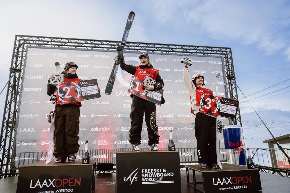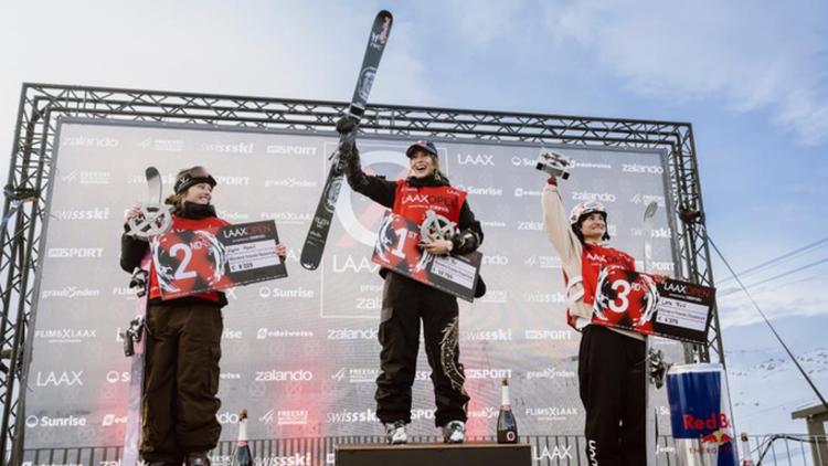 1月17日,获得女子自由式滑雪坡面障碍技巧冠军的谷爱凌(中)在领奖台上。当地时间1月14日至18日,国际雪联世界杯系列赛在瑞士莱克斯举行。新华社发(马塞尔·莱默希特摄)