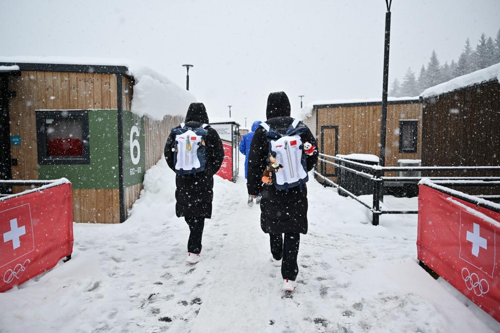 2月3日,中国体育代表团成员走在科尔蒂纳冬奥村里。新华社记者连漪 摄