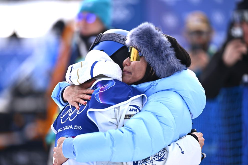 2月9日,谷爱凌(左)在完成第一跳后和妈妈拥抱。新华社记者张宏祥 摄