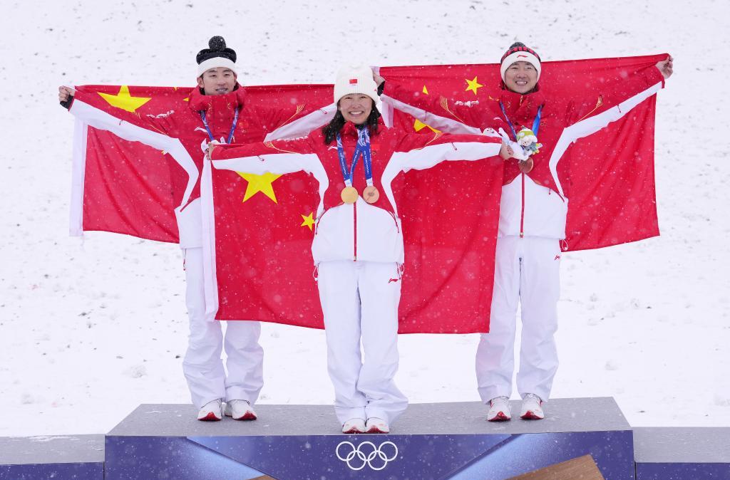2月22日,英国选手阿特金、中国选手谷爱凌、中国选手李方慧(从右至左)在颁奖仪式上。新华社记者 张宏祥 摄