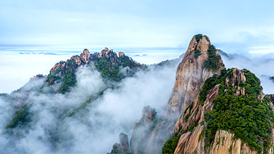 安徽省池州市九华山风景区,春雨初霁,山峰在云雾映衬下若隐若现,梦幻缥缈,蔚为壮观。