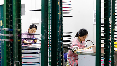 江苏省宿迁市泗洪经济开发区内,务工人员在生产车间赶制出口羽毛球拍订单。