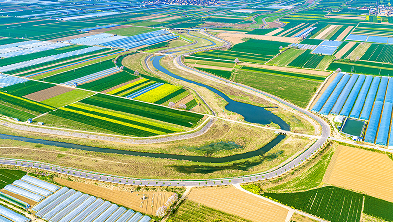 春日时节,俯瞰山西省运城市黄河一号旅游公路夏县支线(涑水河夏县段),生机盎然。
