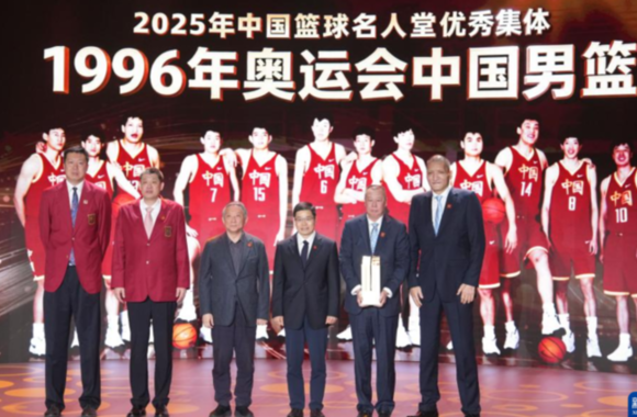 4月12日,中国篮球名人堂“优秀集体”1996年奥运会中国男篮代表王治郅(左一)、孙军(左二)、宫鲁鸣(左三)、吴庆龙(右二)、巴特尔(右一)在入堂仪式上领取奖杯。