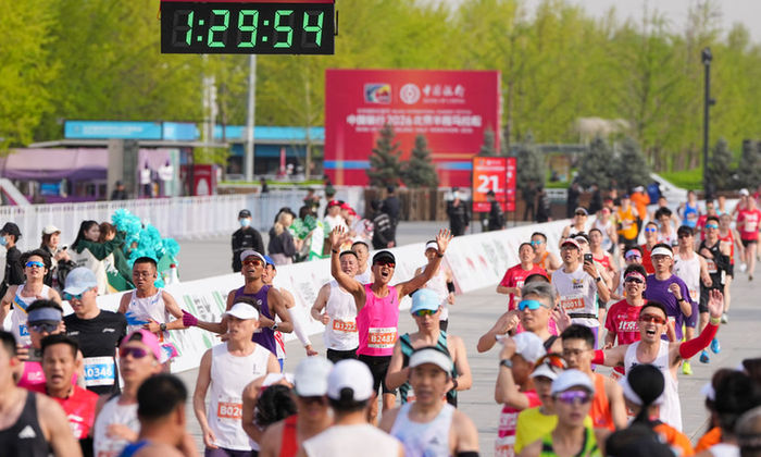 4月12日,2026北京半程马拉松参赛选手通过终点。新华社记者鞠焕宗 摄